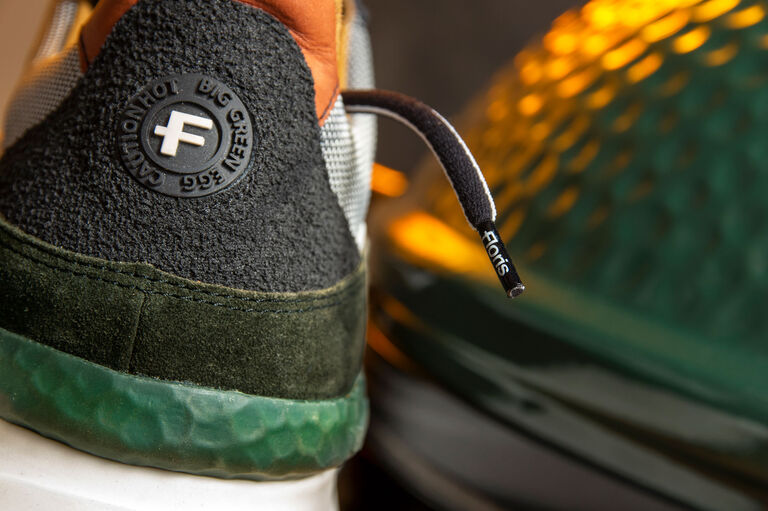 Auf dem grünen Gummi hinten an der Ferse ist teils in der Schriftart von Big Green Egg und teils in der von Floris van Bommel zu lesen: „Big Green Floris“. Die Dellen im Gummi sind eine exakte Kopie der Dellen, die die Keramikhülle des Big Green Egg aufweist. Für das Design wurden die originalen 3D-Dateien von Big Green Egg verwendet.