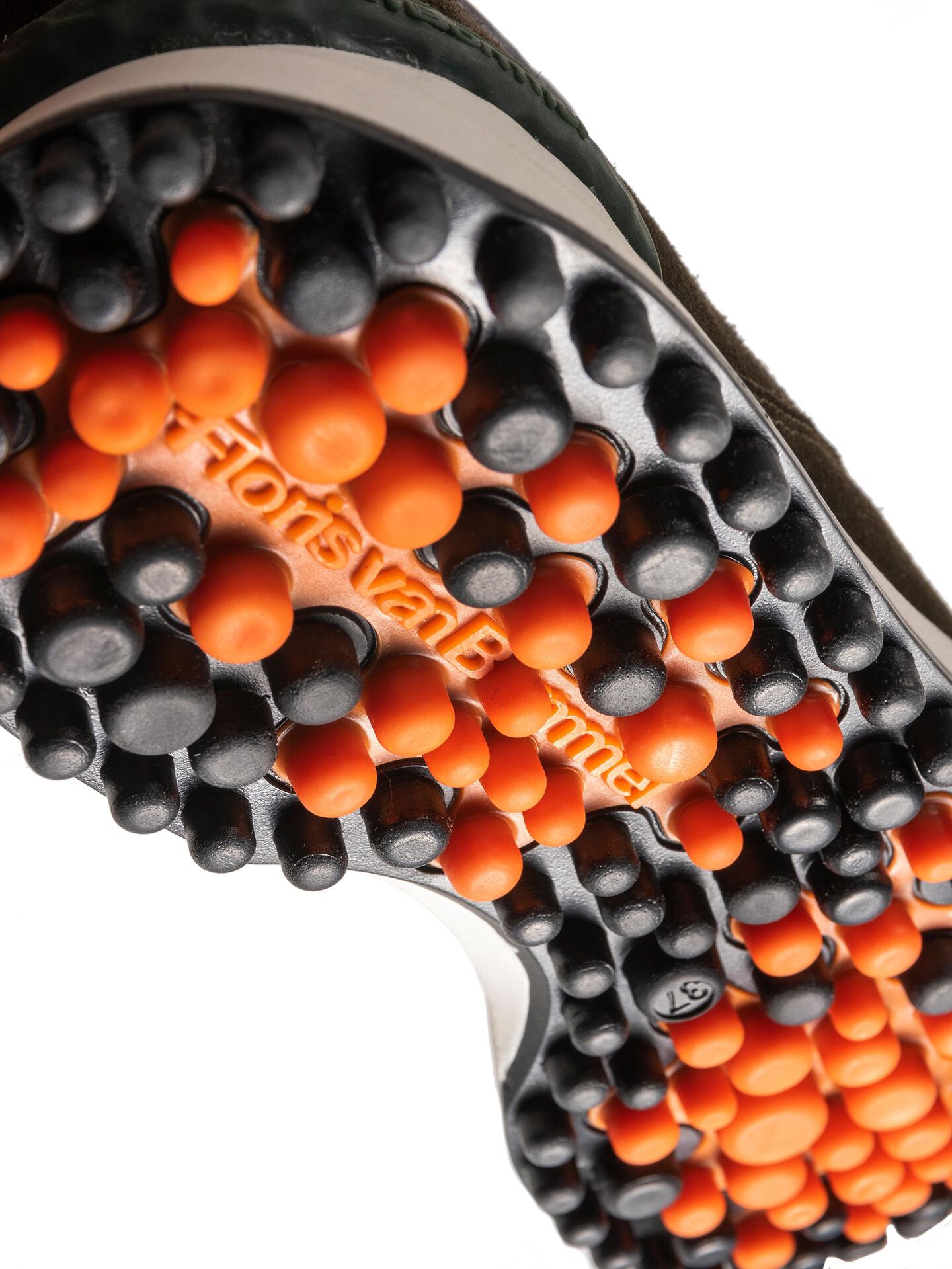 Einmal wirklich auf heißen Kohlen laufen. Einige der Noppen an der Lauffläche der Sohle sind in einer leuchtend orangen Farbe gehalten. Man sieht gleich, dass sie wie die glühenden Kohlen im Big Green Egg aussehen.