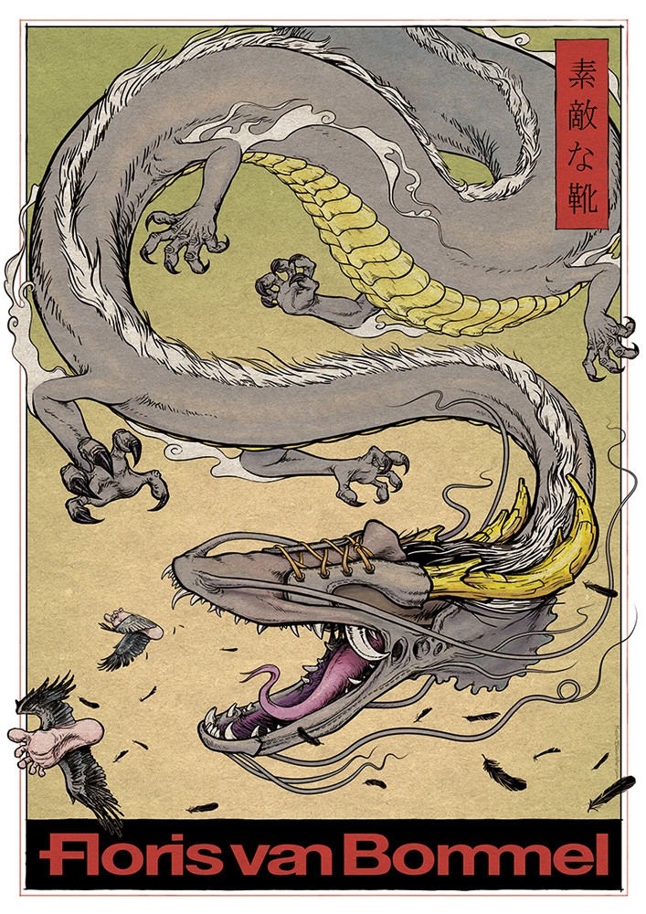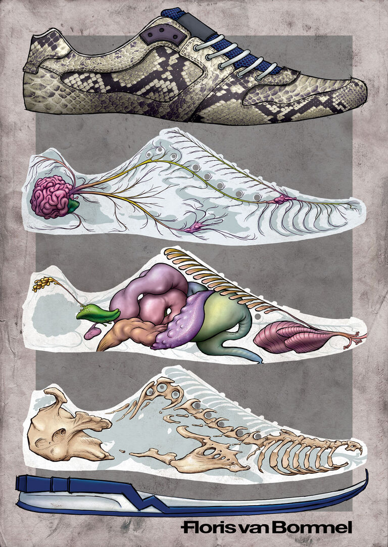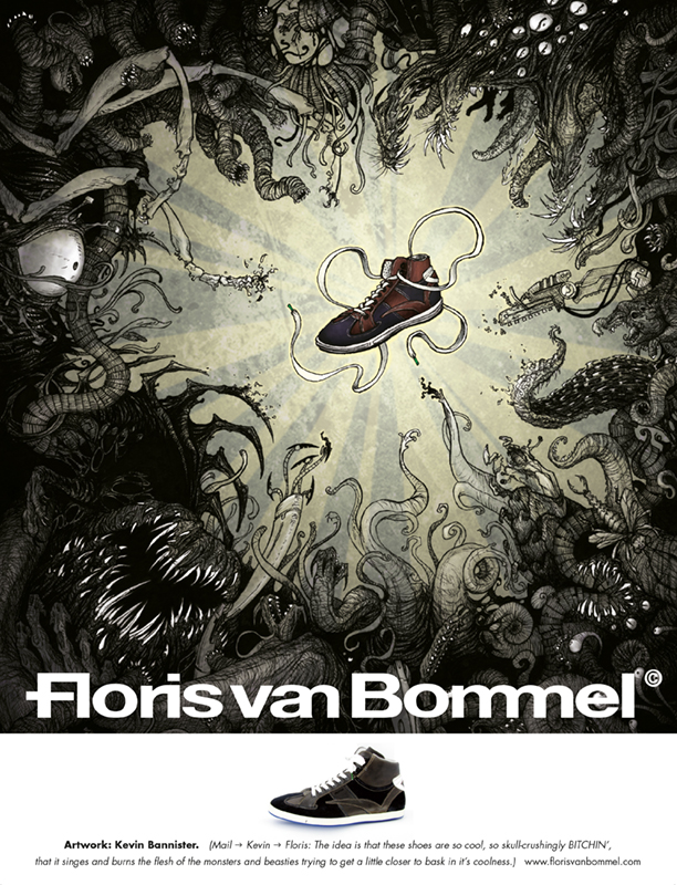 In der Zwischenzeit hatte ich mich etwas mehr über den Künstler informiert. Sein Name war Kevin Bannister und er nannte sich damals „creature designer“. Ich fand eigentlich alles, was er je gezeichnet hat, super cool. Auf seiner Website habe ich in der Rubrik Kontakte gesehen, dass er auch Aufträge annimmt. Also beschloss ich, es zu wagen und schrieb ihm eine E-Mail, um zu fragen, ob er daran interessiert wäre, eine Anzeige für uns zu zeichnen. Kevin sagte zu. Ich habe ihm einen Freibrief gegeben. Das Ergebnis ist das Bild unten, mit einem Schuh, der von Monstern umgeben ist. Als Kevin mir seinen Entwurf per E-Mail schickte, hatte er noch diesen Satz als Erklärung hinzugefügt: „The idea is that these shoes are so cool, so skull-crushingly BITCHIN’, that it singes and burns the flesh of the monsters and beasties trying to get a little closer to bask in its coolness.” Ich fand das so witzig, dass ich diesen Satz als Fußnote an die Anzeige gehängt habe.