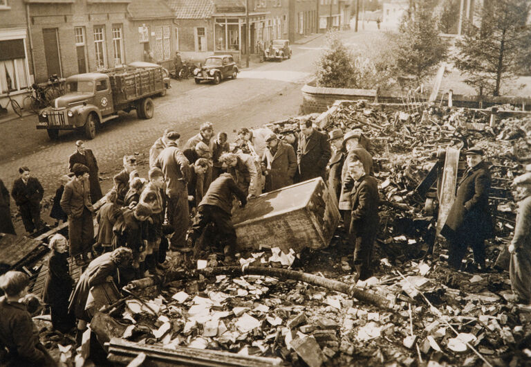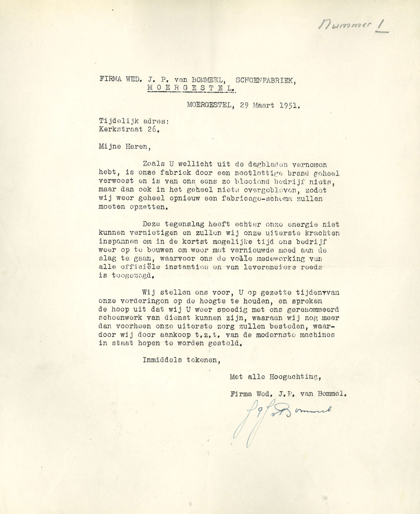 In der Nacht zum Ostermontag 1951 schlägt ein Blitz in die Schuhfabrik van Bommel ein. Das Gebäude, das seit 1835 als Schuhmacherwerkstatt diente und 1911 in eine Schuhfabrik umgewandelt wurde, brannte bis auf die Grundmauern nieder. Das Lebenswerk der Familie Van Bommel war zerstört. Nach einigen Tagen der Trauer begannen eine Woche nach dem Brand die Vorbereitungen für den Bau einer neuen Fabrik. Es wurde ein neues Grundstück außerhalb des bebauten Kerns von Moergestel gekauft. Die alte Fabrik lag neben der Kirche, mitten im Zentrum von Moergestel. Das war nicht gerade ein guter Standort für eine Fabrik. In Rekordzeit wurden Genehmigungen eingeholt, Zeichnungen angefertigt und mit dem Bau begonnen. Jan van Bommel überwand seine Flugangst und reiste zur Maschinenfabrik nach England, um neue Maschinen zu beschaffen. Beim Neubau wurden die Fabrikangestellten als Fundament- und Bauarbeiter eingesetzt. In der Zwischenzeit organisierte die Unternehmensleitung einen Notstandort, an dem die Produktion in begrenztem Umfang wieder aufgenommen werden konnte. Acht Monate nach dem Brand wurde die neue Fabrik am Oisterwijkseweg eröffnet.