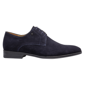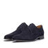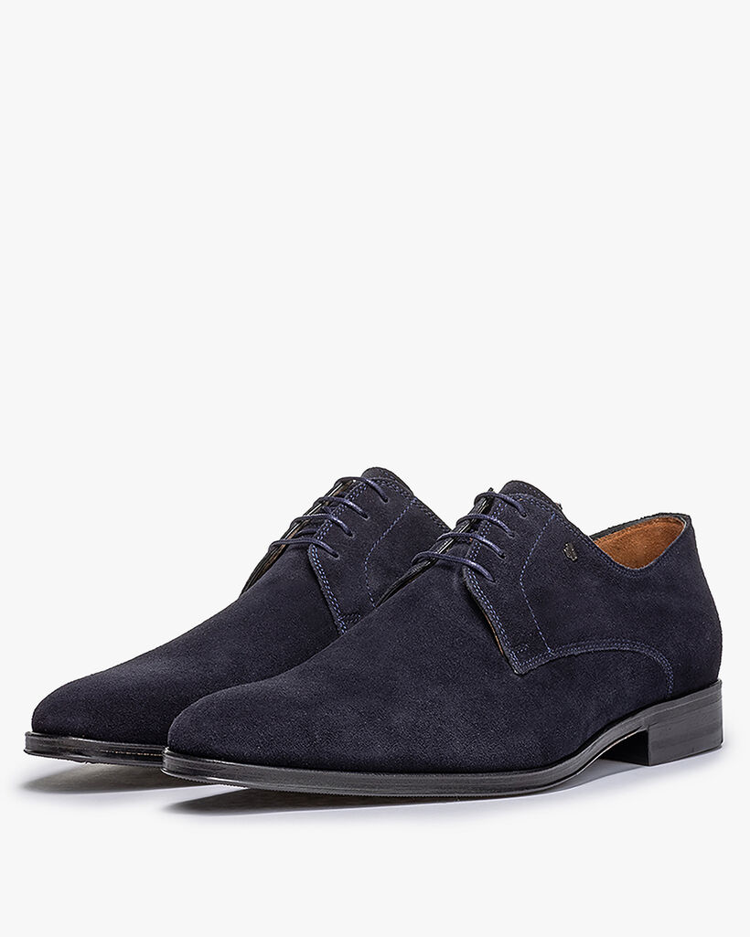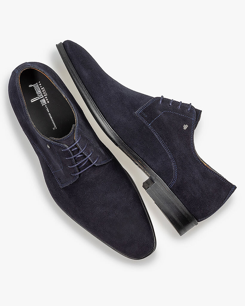 Dieses Oxford-Modell mit gerader Zehenkappe ist Teil der klassischen Van Bommel Kollektion. Der Schuh wurde nach der Blake-Methode gefertigt. Die Lauffläche der Sohle hat ein feines, rutschfestes Profil. Die Sohle besteht aus pflanzlich gegerbtem Leder, das von Hand mit einem stilvollen Finish versehen wurde. Der Absatz ist durch eine elegante Schwalbenschwanzverbindung in zwei Bereiche unterteilt. Der Teil, der beim Gehen am stärksten beansprucht wird, besteht aus strapazierfähigem Gummi, während der angrenzende Teil aus dem gleichen pflanzlich gegerbten Leder wie die Mittelsohle gefertigt ist. Damit der Absatz nicht am Hosensaum hängenbleiben kann, wurde die Absatzspitze auf der Innenseite angeschliffen. An der Seite des Sohlenrands sind oben und unten zwei sehr feine Einkerbungen eingefräst. Der obere Lederrand des Schuhs ist hochwertig verarbeitet und mit einer schmalen schwarzen Paspel versehen. Das Obermaterial besteht aus erstklassigem dunkelblauem Wildleder. An der Schuhseite wurde beim obersten Schnürsenkelloch das markante kupferne VB-Logo in das Leder eingeprägt. Das Innenfutter besteht komplett aus hochwertigem Kalbsleder.