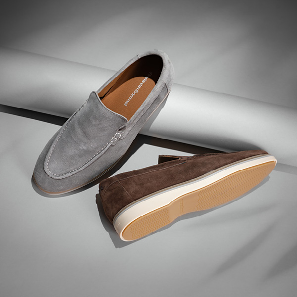 Der Oister ist als sportlicher Loafer und als sommerlicher Stiefel erhältlich. Beide Modelle sind in verschiedenen neutralen Wildlederfarben gefertigt. Das Wildleder wurde in der Gerberei zusätzlich mit natürlichen Ölen behandelt, wodurch es ein edles, luxuriöses Aussehen und einen geschmeidigen Touch bekommt. Die Sohle ist an der Innenseite mit einer dezenten, charakteristischen Floris van Bommel-Zickzacklinie versehen.