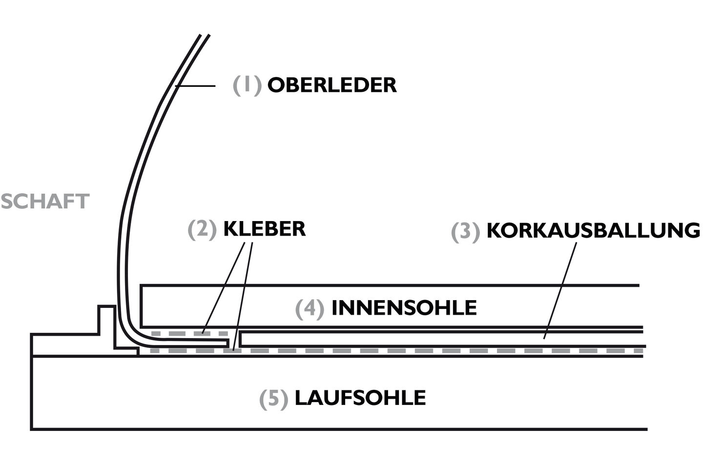 Das Oberleder (1) wird auf den Leisten gezogen und unter der Innensohle (4) mit Klebstoff befestigt. Unter den Fuß wird eine kleine Menge Kork (3) gelegt, um ihn optimal zu stabilisieren. Die vorgefertigte Laufsohle (5) (mit einem bereits an der Sohle befestigten Sohlenrand) wird mit Klebstoff (2) an der Innensohle (4) befestigt.