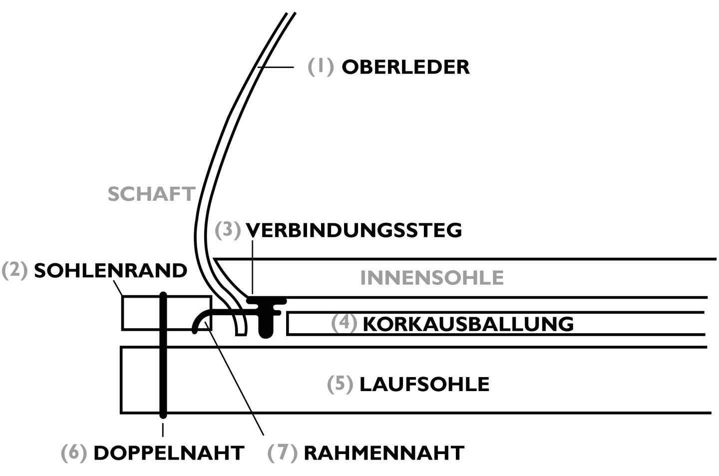 Das Oberleder (I) wird auf den Leisten gezogen. Ein Horizontalstich (Rahmennaht) (7) befestigt das Oberleder (I) am Sohlenrand (Rahmen) (2) und am Verbindungssteg (3) (der an der Innensohle befestigt ist). Eine Korkschicht (4) füllt den Bereich aus, der unter dem Fuß durch die Goodyear-Machart/ den Verbindungssteg entstanden ist (3). Die Laufsohle (5) wird mit vertikalen Nähten befestigt (Laufsohlen- oder Doppelnaht) (6), die durch den Sohlenrand (Rahmen) (2) und die Laufsohle (5) gehen.