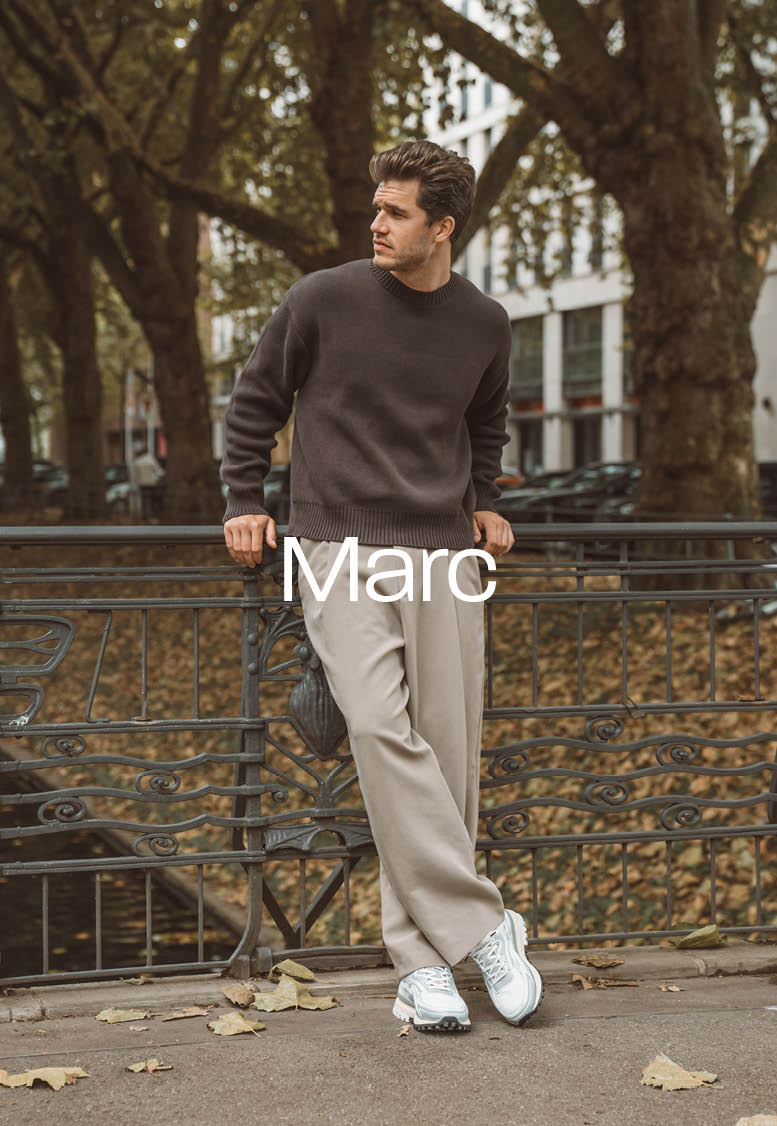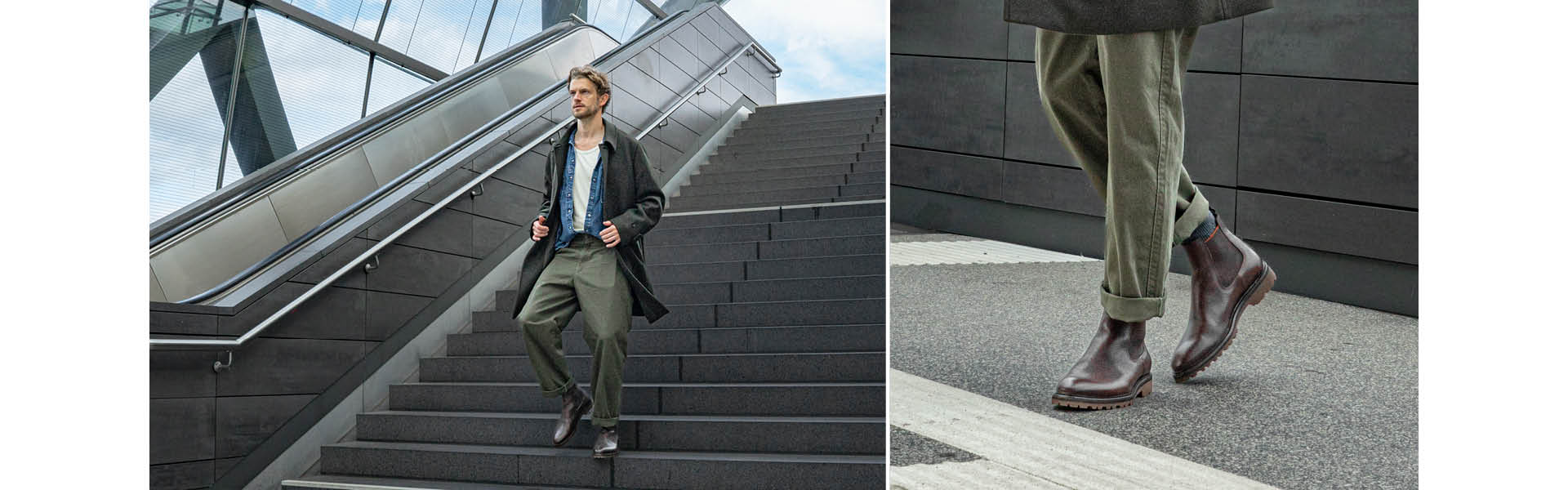 Marc zeigt, wie er einen bedruckten Wildleder-Schnürschuh, einen dunkelblauen Wildlederstiefel, den brandneuen „De Gripper“ aus einem technischen Materialmix und den „De Zaler“ aus unserer Winterkollektion stylt.
