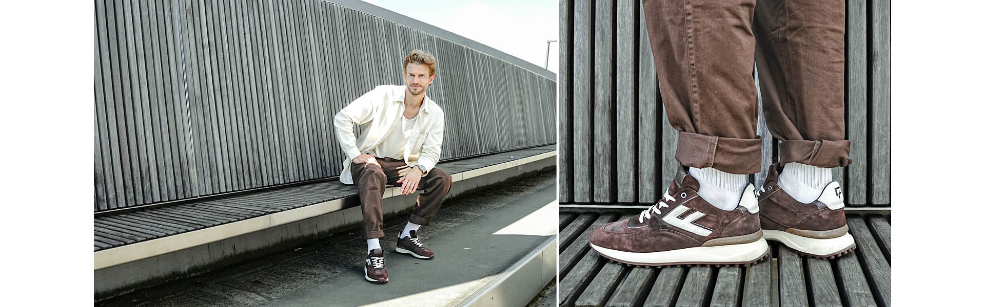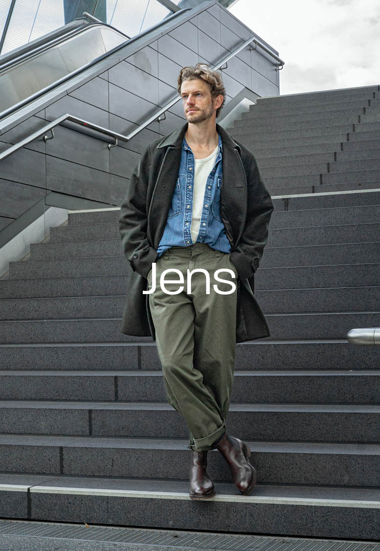 Jens zeigt, wie er die dunkelbraunen „Noppi“- und orangefarbenen „De Treener“-Sneaker, einen klassischen cognacfarbenen Schnürschuh und einen lässigen Chelsea-Boot aus unserer Winterkollektion stylt.