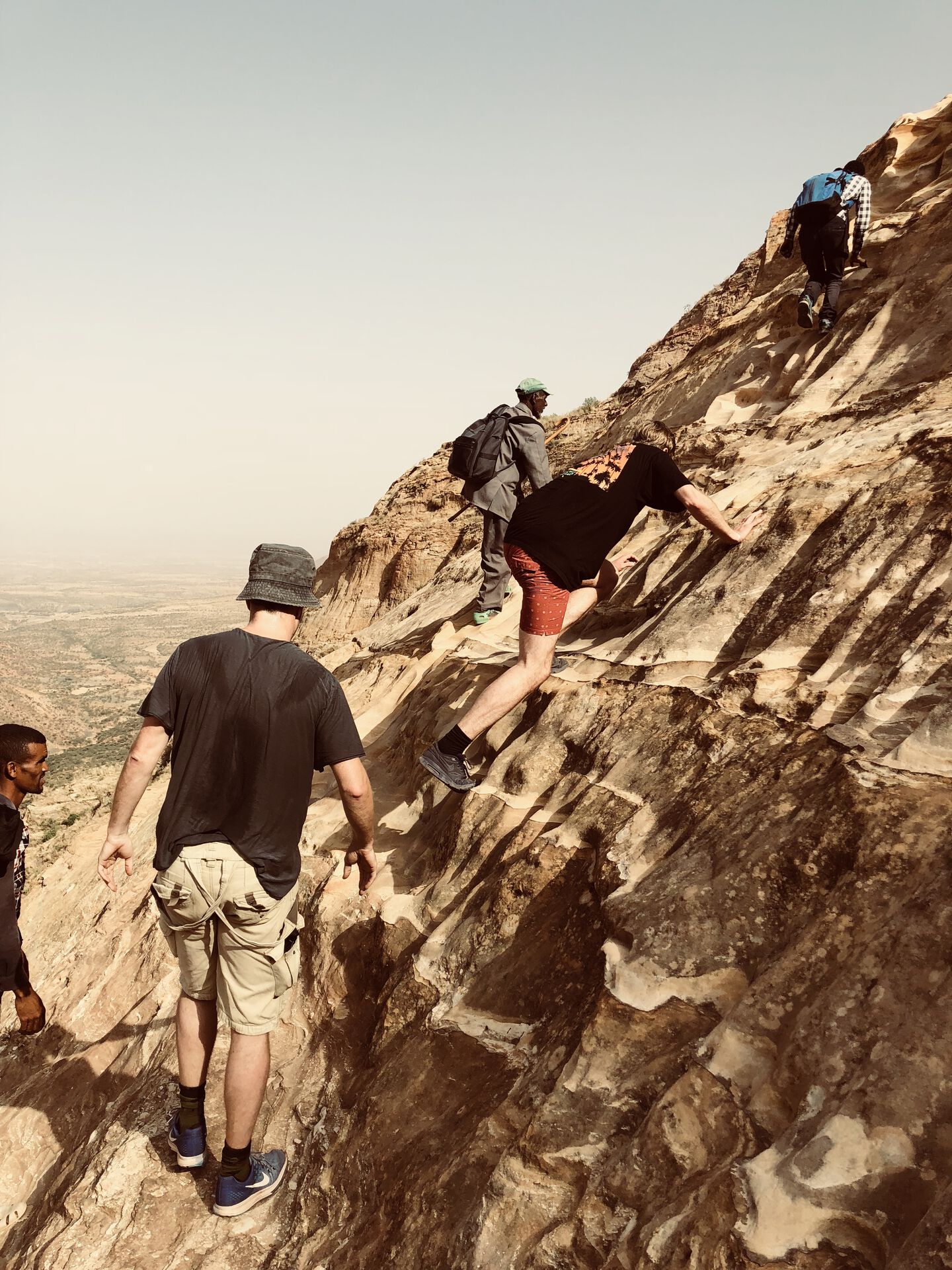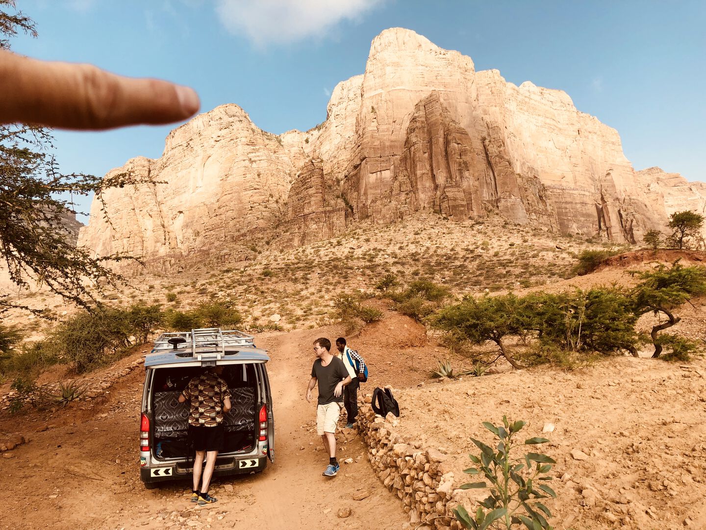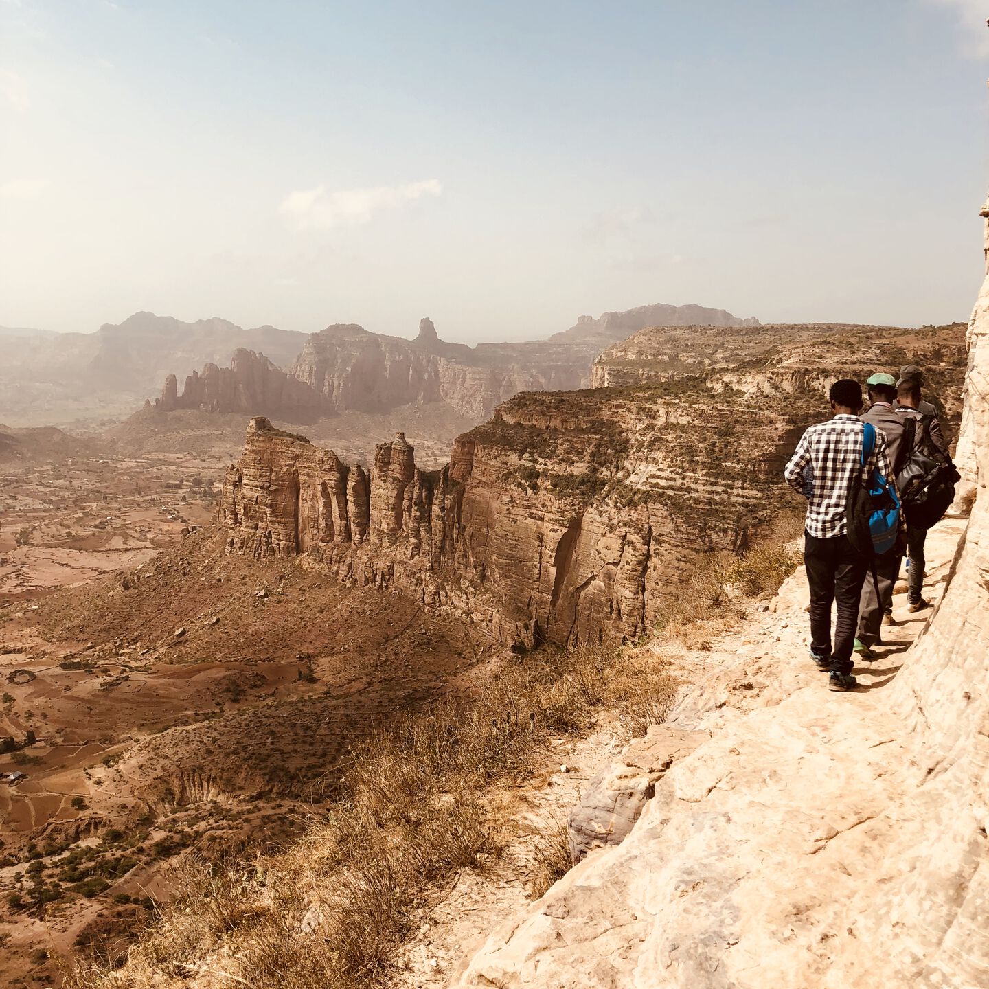 31. Mai in Tigray, Äthiopien. Unser einheimischer Bergführer erklärt uns zu Beginn unserer Wanderung zu einem schönen Aussichtspunkt, dass wir eine ‚mittelschwere‘ Wanderung unternehmen werden. Bald stellen wir fest, dass diese Wanderung alles andere als mittelmäßig ist. Wir klettern eine Stunde lang entlang steiler Abhänge, zwischen Schluchten und über lose Steine. Aber es lohnt sich. Die Aussicht und die prächtige Landschaft waren der Wahnsinn.