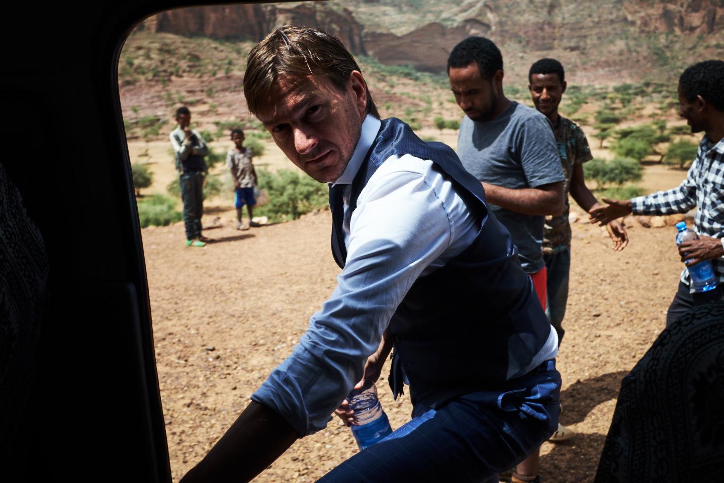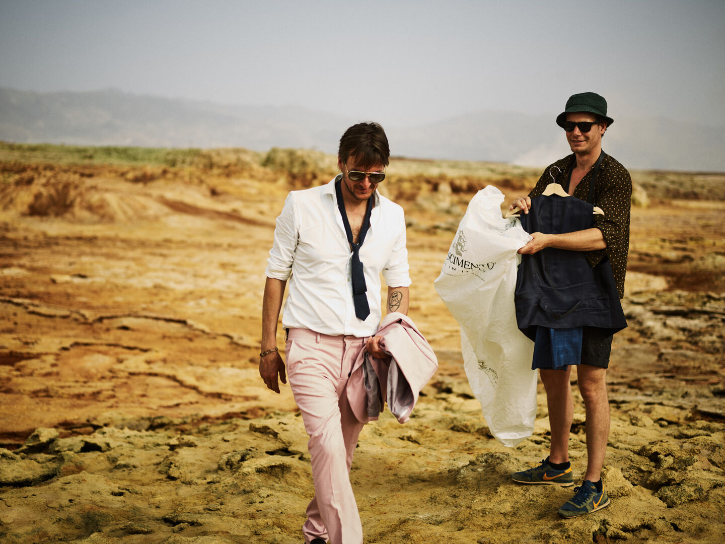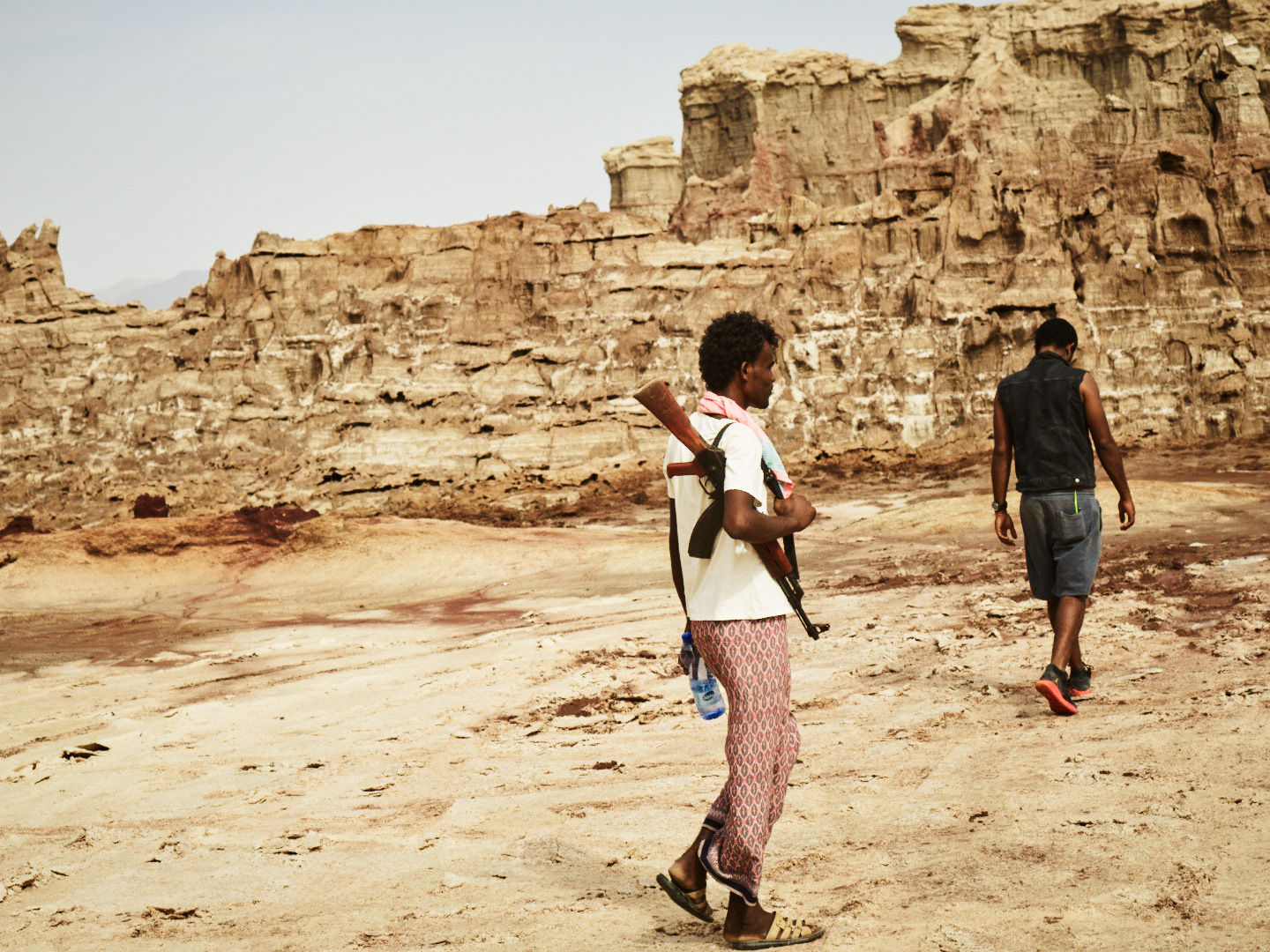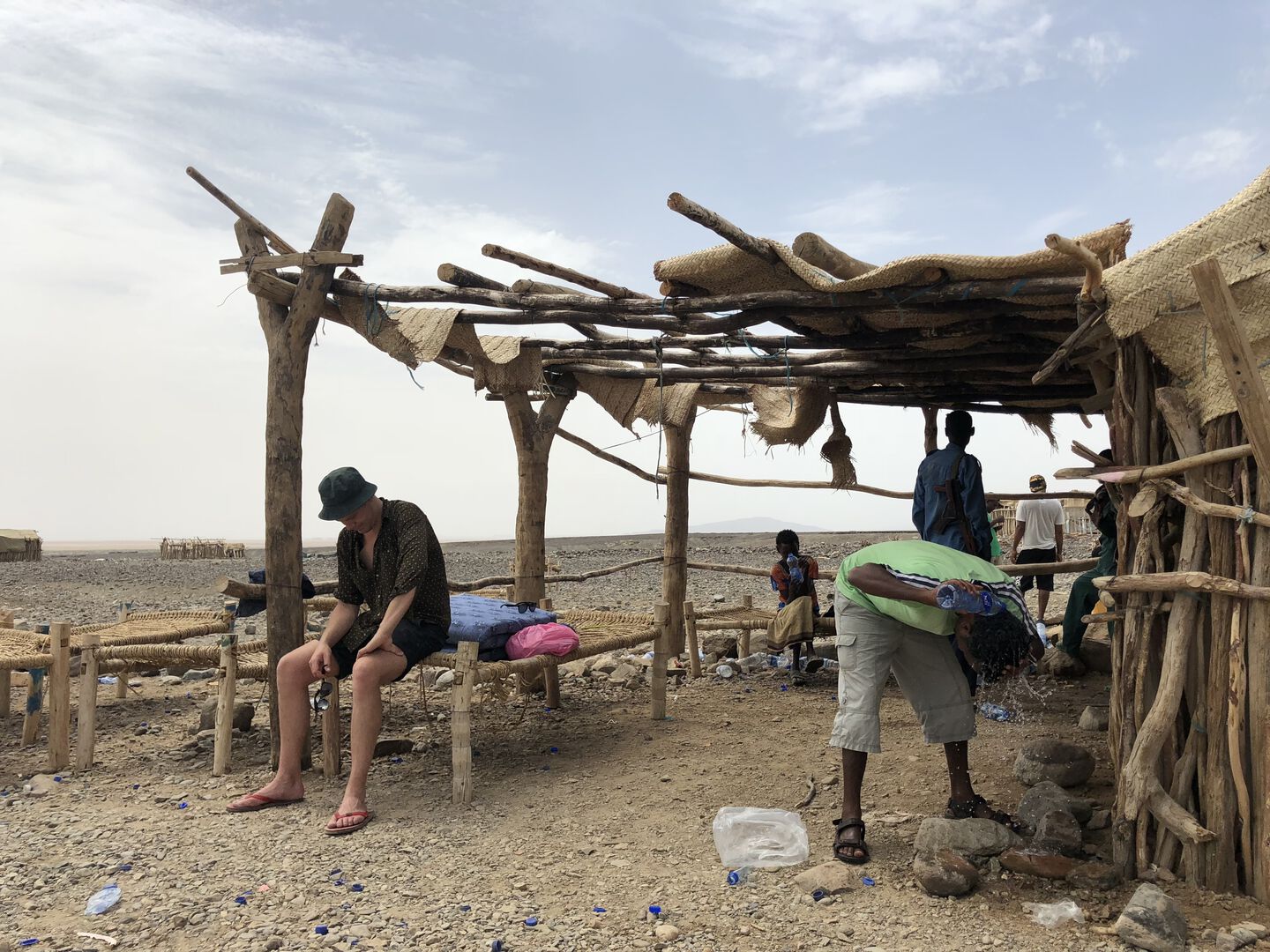2. Juni in Afar, Äthiopien. Wir sind ein paar Stunden gefahren und jetzt sind wir in der Hölle auf Erden gelandet. Wir steigen in einer Art Wüstenlandschaft aus, wo es absolut nichts gibt. Es sind mindestens 46 Grad, aber der Wind bläst wie verrückt. Mindestens Windstärke 7. Es gibt nirgendwo Kühlung. Das Trinkwasser ist glühend heiß. Unsere Unterkunft ist eine Hütte aus Pfählen und Stroh. Diese Hütte ist aber nur zum Kochen gedacht. Wir schlafen draußen auf wackligen Holzbetten. Unser Reiseführer hat uns gerade erzählt, dass der örtliche Afar-Stamm der aggressivste Stamm in ganz Afrika ist. „Sehr aggressiv, ja. Aber kein Problem, wir schlafen draußen.“ Der Plan war, hier zwei Nächte zu bleiben. Innerhalb von zwei Minuten wurde entschieden, dass das keine gute Idee war. Wir haben alle Drehorte und Dreharbeiten in einem Tag abgehandelt und sind nach einer Nacht mit quietschenden Reifen abgereist.