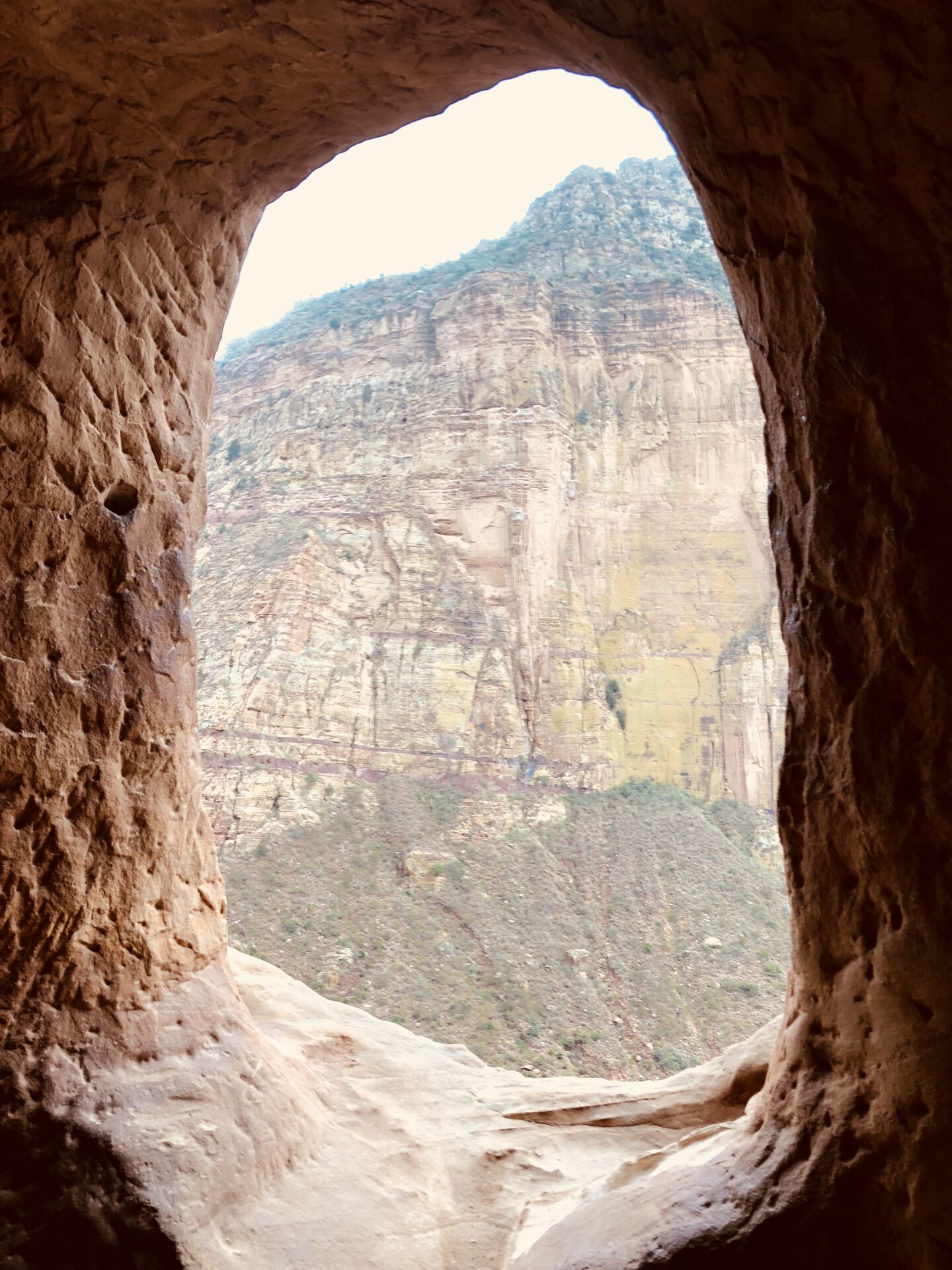 Ein rundes Loch in der Mitte der Felswand führt zu einem ausgesparten, ungefähr 6 m2 großen Loch. Niels sitzt auf dem Boden, sein Blick ist verschwommen. Elmar lacht ein wenig. Ich werde von einem mulmigen Gefühl der Panik, Höhenangst, Müdigkeit, Schwindel und Verwirrung überwältigt. Es fühlt sich surreal an. Wo zum Teufel bin ich? Ich spüre, wie sich der Boden der Höhle unter mir bewegt (Niels sagte später, dass er das auch hatte). Ich kann nicht fassen, dass ich mich 300 Meter über dem Boden in einem Felsloch befinde, dessen einziger Ausgang ein 30 cm breiter Vorsprung ist (das dachte ich jedenfalls). Ich kann es einfach nicht fassen.