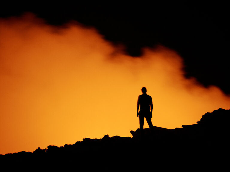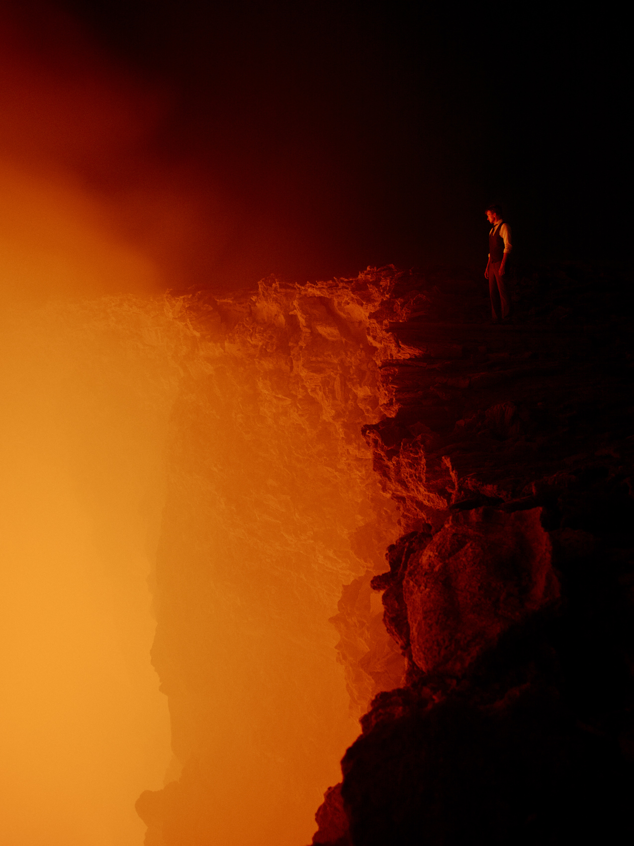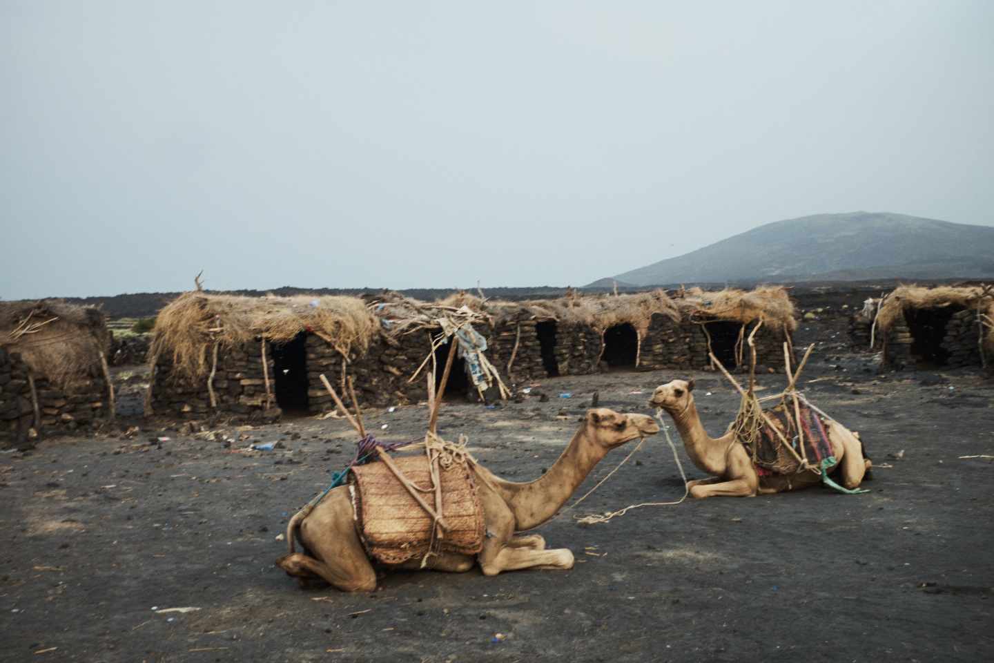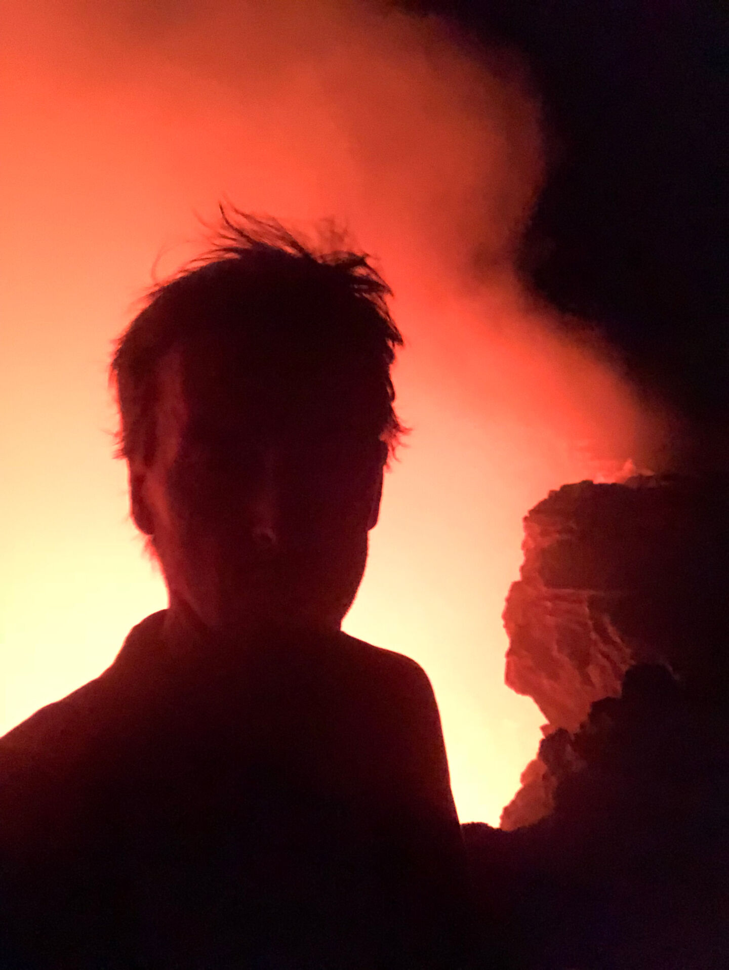 1. Juni in Afar, Äthiopien. Bis jetzt waren wir auf dem Hochplateau von Äthiopien. Das ist der erschlossene Teil des Landes mit einem milden Klima. Jetzt fahren wir ins Tiefland, dem Holzhütten-Teil des Landes mit dem offiziell heißesten Klima der Welt. Wir werden im Dunkeln einen aktiven Vulkan besteigen (denn tagsüber ist es zu heiß dafür). Guter Plan natürlich! Nach einer anstrengenden Wanderung von mehr als 10 km erreichen wir gegen 23 Uhr den Gipfel des Vulkans. Ich stehe weniger als einen halben Meter von der bröckeligen Kante entfernt und blicke in den Krater hinunter, während der Wind in Richtung des Lochs bläst. Nicht gerade sicher das Ganze. Etwa 50 Meter weiter unten im Krater können wir durch die Schwefeldämpfe hindurch irre Lavaexplosionen sehen. Der Lavasee hat einen ähnlichen Klang wie ein wildes Meer, nur ein paar Oktaven höher. Eine unglaubliche Erfahrung. Nachdem ich das überlebt habe, ziehe ich meinen Anzug im Camp an, das etwas weiter unten an der Straße liegt, und wir machen ein paar tolle Fotos und Aufnahmen am Lavasee. Wir verbringen die Nacht auf dem Gipfel des Vulkans unter freiem Himmel, inmitten von allerlei Krabbeltieren. „Wenn du auf die Toilette musst, dann geh einfach hinter den Kamelen!“