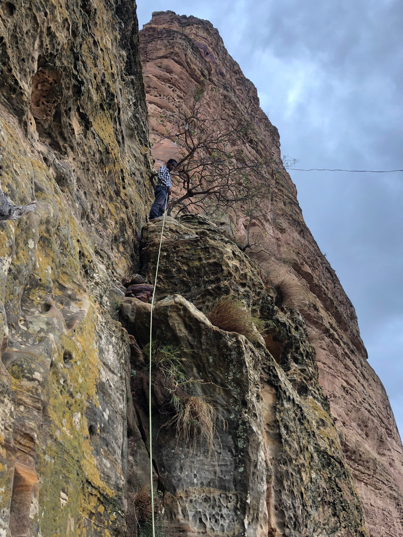 Wir sind schon mindestens 200 Meter steil aufgestiegen und klettern mit fragwürdiger Sicherheitsausrüstung eine senkrechte Felswand von etwa 8 Metern hoch. Bald darauf erreichen wir eine Art Adlernest-Plateau von etwa 4 Quadratmetern. Wir sind sehr weit oben und um uns herum geht es tief hinab. Ein Stück weiter und drei Meter höher sehe ich einen Mann mit Bart auf einem Felsvorsprung sitzen. Das muss das Ende sein. Noch zwei weitere Luftsprünge über Hunderte von Metern Tiefe und ein senkrechter Aufstieg von drei Metern und wir sind am Ziel. Das dachte ich zumindest.
