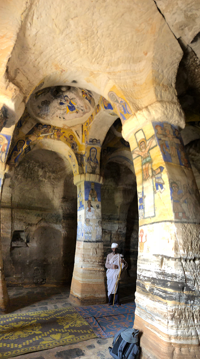 In dem Loch befindet sich eine kleine Holztür zu einer Kirche, die noch tiefer in den Fels gehauen ist. Das war der ganze Grund für den Aufstieg. Die Tür öffnet sich und ein Priester führt uns herum. Es ist wunderschön. Unser Bergführer erzählt uns von den Wandmalereien, „Das sind die 12 Apostel.“ Ich denke mir: ‚Super gemacht du Dussel, du führst hier ein nettes Gespräch über deine Apostel, während ich darüber nachdenke, wie ich diesen Raum dekorieren werde, denn schließlich werde ich ja FÜR DEN REST MEINES LEBENS HIER FESTSITZEN!‘ Alles dreht sich noch. Ich habe Pudding in den Beinen und bin überzeugt, dass ich kollabiere, wenn ich noch einmal auf diesen Vorsprung steigen muss. Zurück in der Höhle, schaue ich durch das klaffende Loch nach oben. Das kann doch nicht. Man kann den Vorsprung von innen nicht sehen, es gibt nur Weite, Tiefe und Höhe da draußen. Ich rutsche auf meinem Hintern in Richtung des Lochs und schaue mir vorsichtig den Vorsprung an. Zu meiner Freude sehe ich, dass er nicht 30 cm, sondern mindestens 80 cm breit ist. Das gibt mir gerade genug Seelenfrieden, um eine Rückkehr zu wagen. Während ich innerlich weine und an Schuhe denke (das ist wichtig, Leute! Schuhe geben Ruhe und Halt! Immer!), steige ich als Erster nach draußen.
