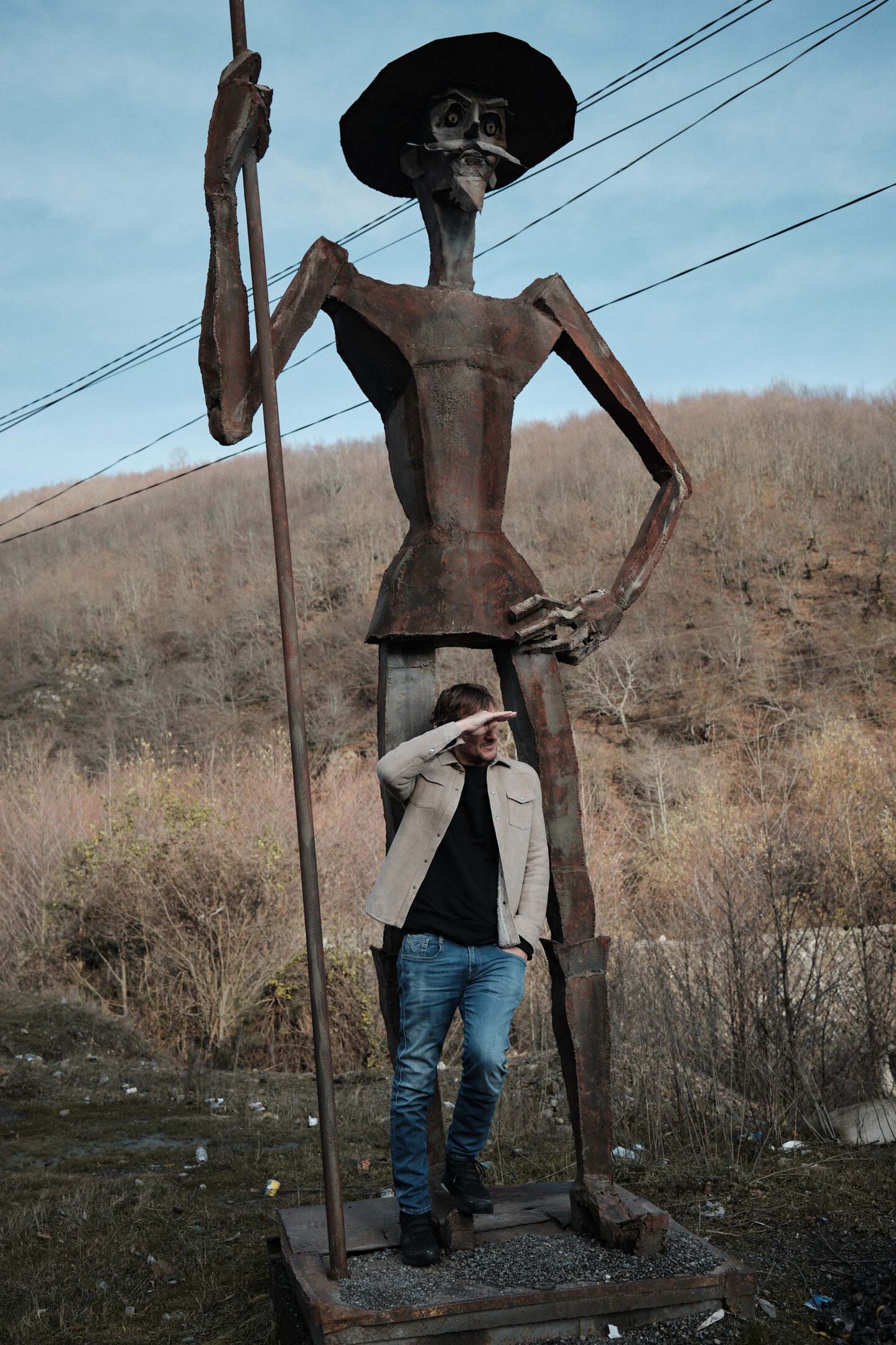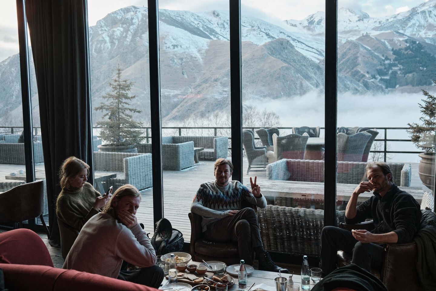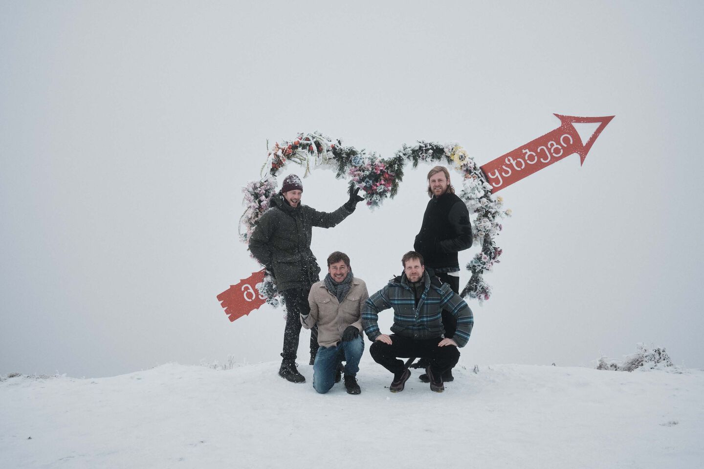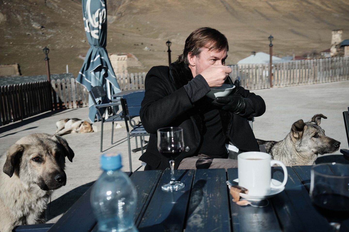 Am Ende des Scouting-Tages in Tiflis haben wir ein paar schöne Locations beisammen. Nur unser Fotograf Elmar ist wegen der trüben Wettervorhersage ziemlich nervös. Wir beschließen, es zu riskieren und fahren am nächsten Tag sehr früh mit Katja in den Kaukasus, auf der Suche nach blauem Himmel. Es ist eine ganz schön lange Fahrt, sodass ich viel Zeit habe, mein Wortspiel, dass ich voll Lust auf „Kau-Cassis“ im Kaukasus habe, perfekt zu timen. Nach drei Stunden Fahrt, nahe der russischen Grenze, riss der Himmel auf. In dem Bergdorf Qasbegi (Stepanzminda) schossen wir die letzten drei Fotos der Reise.