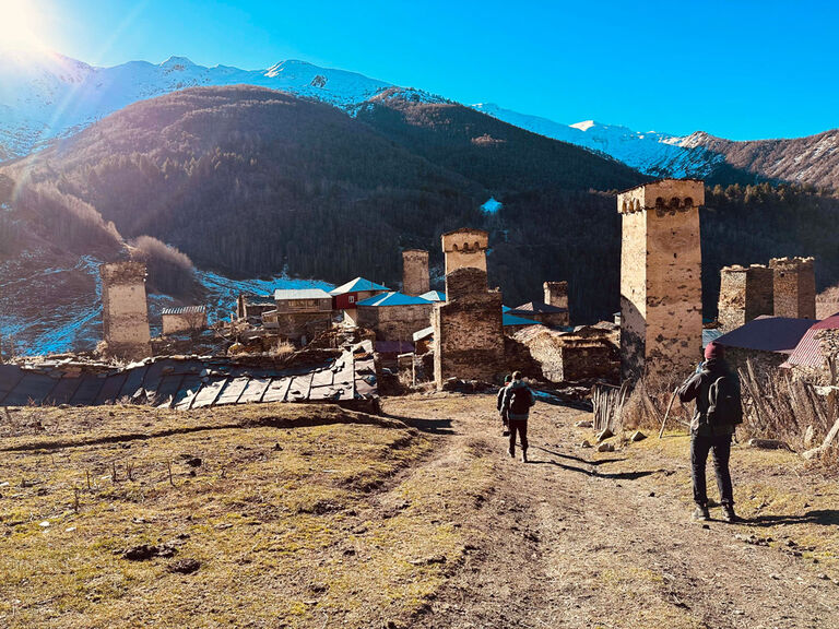 Die folgenden Tage verbringen wir auf einer Wahnsinnstour von der russischen bis zur türkischen und armenischen Grenze und allem, was dazwischen liegt. Höhepunkte: die Swanetischen Türme, die Felsenwohnungen in Wardsia und die Ruinen von Tmogwi. In der Hauptstadt Tiflis nehmen wir uns einen ganzen Tag Zeit, um die Locations für den Fotoshoot, den wir dort noch mit Katja Schuurman haben werden, auszukundschaften. Unter anderem spazieren wir durch den berühmten Botanischen Garten von Tiflis, aber der ist uns ein bisschen zu öde. Ein Botanischer Garten ist eigentlich eine Art Zoo, nur ohne Tiere.