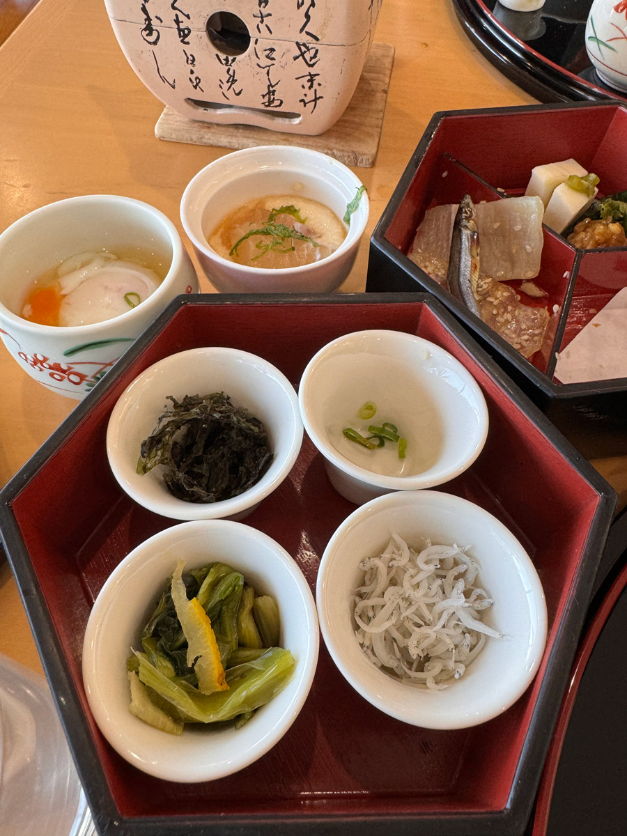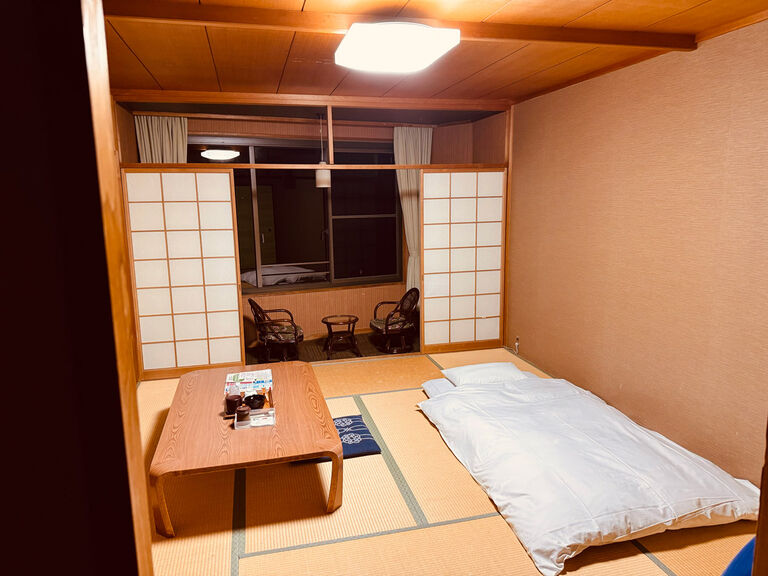 Was ich inzwischen auf all diesen Fernreisen gelernt habe, ist, dass das romantische Bild von Dingen, denen das Wort „lokal“ oder „traditionell“ voransteht, meist nicht der Realität entspricht. „Lokales Frühstück“ in Japan ist ein komplettes Abendessen mit einem eigenen blubbernden Eintopf und Pilzen neben dem Teller, dahinter ein privater kleiner Grill mit – keineswegs geruchlosen – Sardinen und etwas Zähem, Knorpeligem. Um meinen Teller herum stehen nicht weniger als acht Schälchen mit allem Möglichen drin. Ich entdecke gerade noch rechtzeitig, dass in der Schale mit den angeblichen Bohnensprossen jeder Spross zwei kleine schwarze Augen hat. Das Hotelzimmer in dieser Nacht ist auch... traditionell. Das Bett ist eine Matte auf dem Boden. Neben der Matte steht ein kleiner Couchtisch mit einem flachen Kissen, auf dem man sitzen kann. Das Zimmer hat kein Bad und keine Dusche, nur ein Waschbecken. Das ist einer der typischen Momente, in denen einem klar wird, woher das Waschbecken seinen Namen hat.