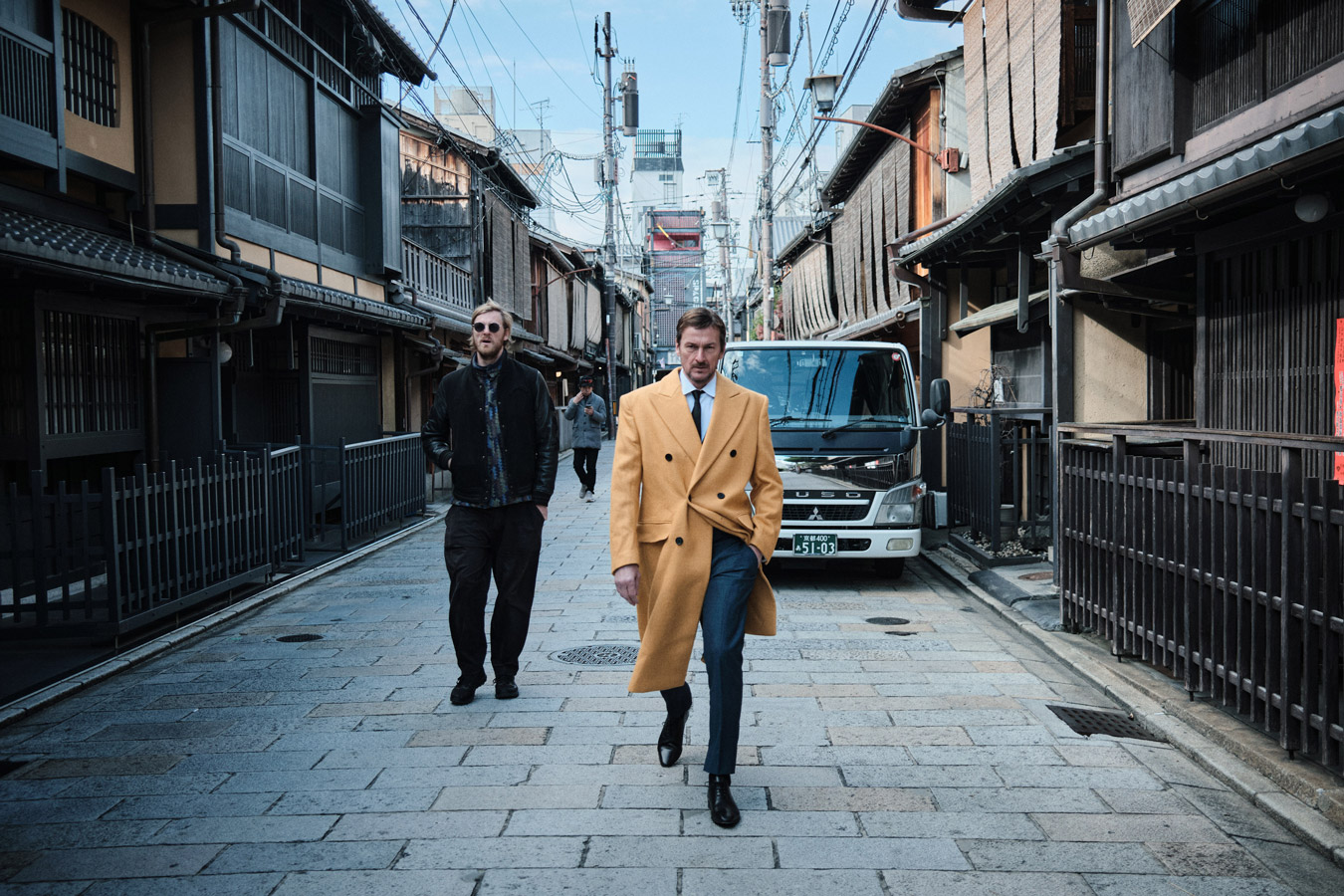 Floris reiste für die Winter-kampagne 2024 nach Japan. Er lief ins Bild, während schöne Landschaftsfotos geschossen wurde, aß versehentlich ein Stück Wal und kleckerte Sojasoße auf sein weißes Hemd. Unter einem roten japanischen Ahornbaum wurde das schönste Foto geschossen.