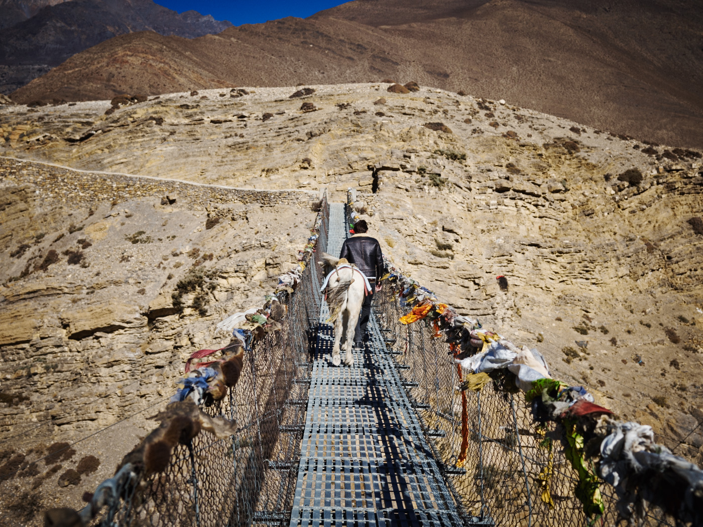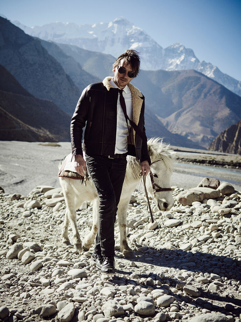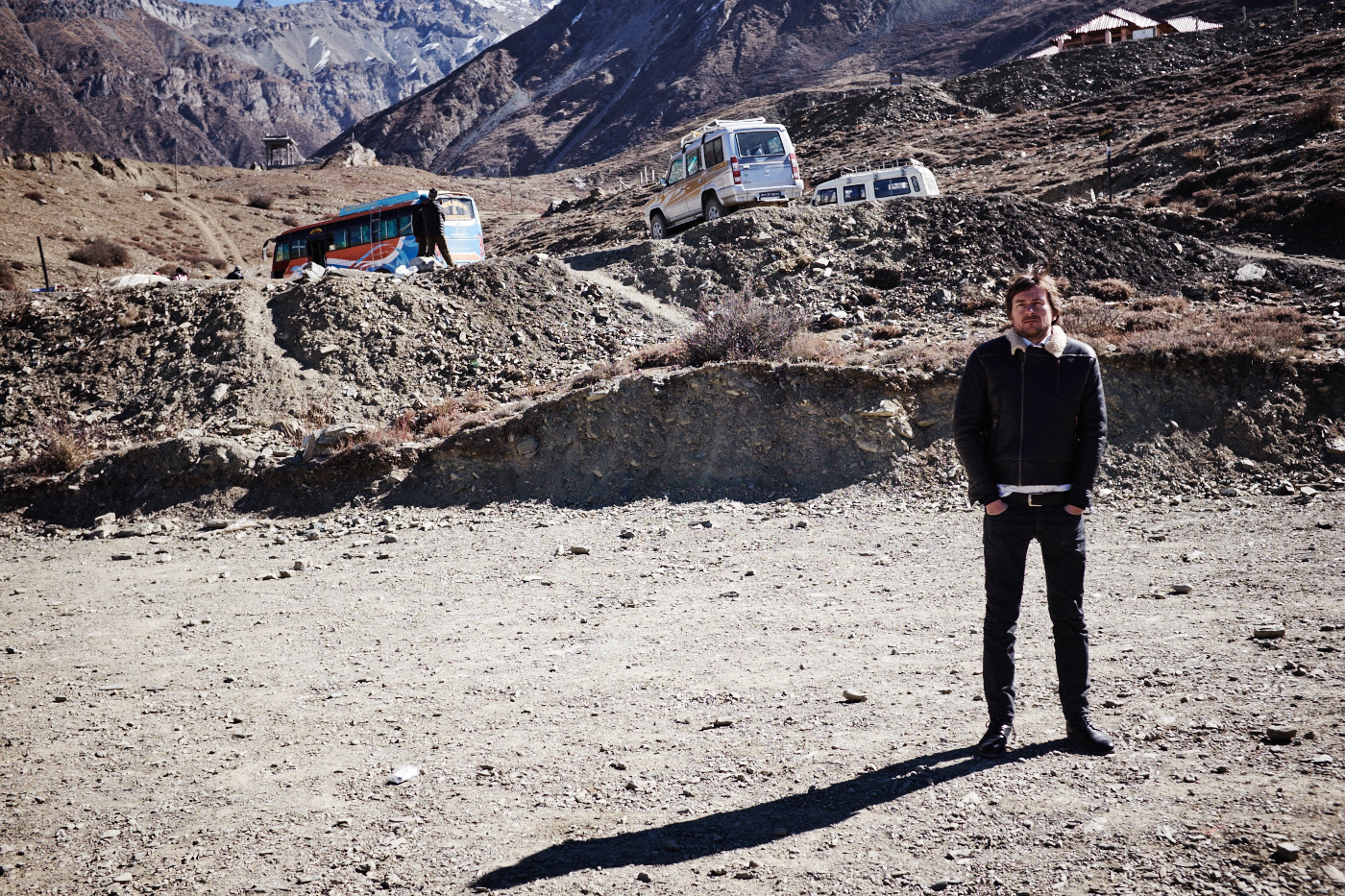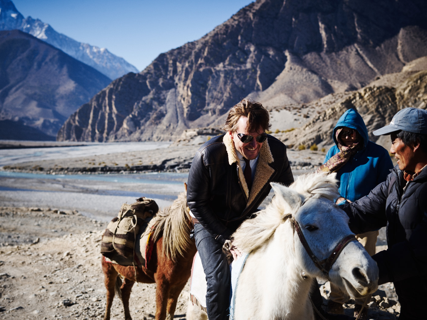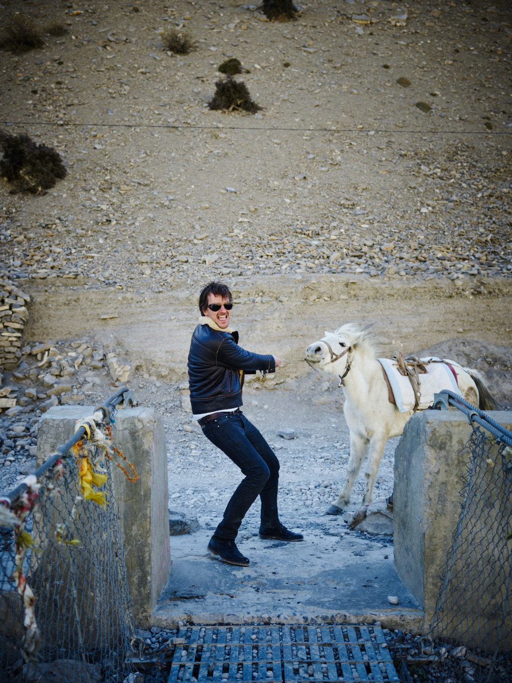„Das Verrückteste war, als ich für den Film allein mit einem Pferd an einem Seil über eine schmale, 100 Meter lange Hangebrücke laufen musste. Ich war erstaunt, dass das überhaupt ging, mit einem Pferd über so eine Hängebrücke zu gehen, aber das ist dort ganz normal. Überhaupt kein Problem. Der Boden der Brücke bestand aus einer Art Drahtgeflecht. Ich konnte direkt hindurchsehen, direkt nach unten, wo ein tosender Fluss herunterströmte. Die Seitenwände bestanden aus einer Art Maschendraht, der etwa einen Meter hoch war. Der Hinweg über die Brücke ging noch ganz gut, da half der Besitzer des Pferdes noch mit, in Gang zu kommen. Aber als ich auf der anderen Seite der Schlucht ankam, mussten wir wieder zurückgehen. Ich stand also alleine mit dem Gaul da. Der Rest der Crew und der Guide waren nur noch kleine Flecken auf der anderen Seite der Schlucht, weit außer Hörweite. Aber das Pferd wollte nicht mehr zurück. „Vergiss es“, dachte es sich wahrscheinlich, „wackelige Hängebrücke, tiefe Schlucht vor mir – ohne mich.“ Aber ich musste ja zurück. Für den Film! Denn dieser Film sorgt dafür, dass wir Schuhe verkaufen, also mussten wir einfach zurück. Und plötzlich steht man da als Tilburger mitten im Himalaya in seinem schicken Anzug am Rande einer 50 Meter tiefen Schlucht mit einem reißenden Wildwasserfluss darunter und zieht mit seinem ganzen Gewicht an den Zügeln eines Pferdes. Das Tier sperrte sich, wie man es nur in Cartoons sieht. Während ich wie ein Idiot zog, standen Furys Beine in der entgegengesetzten Richtung schräg im Sand. Es ist ja nicht so, dass ich in Panik geraten wäre oder so, aber ich habe mir schon gedacht: „Verdammt nochmal, ich werde hierbei noch sterben... aber ich muss auch Schuhe... verkaufen... Schuhe!!!“ Nachdem ich eine Minute lang herumgezogen habe, hatte ich eine Idee. Das Seil dieses Sturkopfes war etwa 2 m lang. Ich hab mich soweit ich konnte auf die Brücke gestellt. Und dann stand ich da und habe ausgestrahlt: „Das musst du schon selbst regeln, ich gehe dann jetzt, sieh selber zu, was du machst.“ Und dann, nach einem weiteren kleinen Ruck und einem 'tssk tssk huu', setzte sich das Pferd endlich in Bewegung.“