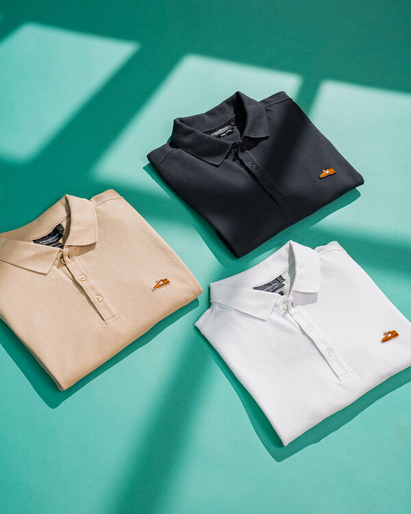 Take a polo shirt that fits well and lay it with the back side up. Then measure according to our sample image. To measure the sleeve length, start in the middle of the back, just below the collar, and measure all the way to the end of the cuff. The model is 1.85 cm and wears size L.